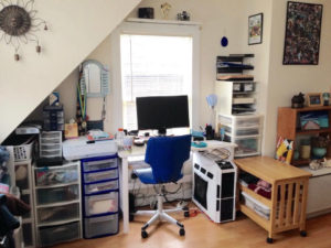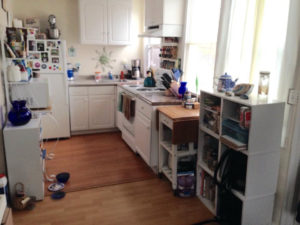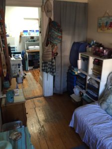 It wasn’t long before I did away with the futon altogether and built a storage bed for myself that was much more functional for the room. There was an attached area that was possibly a walk-in closet at one time. I made that into my office and storage space. The rest of my things were in a rented storage bin down the street. There was no room for it and it was all stuff that I wasn’t ready to let go of. The storage bin had the added benefit of having space to put whatever I got when I cleaned out my mother’s house as well, so it was worth it.