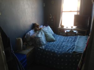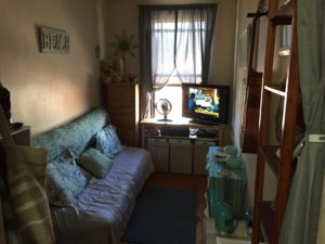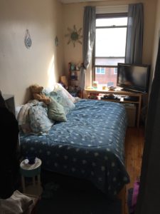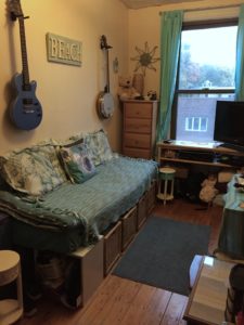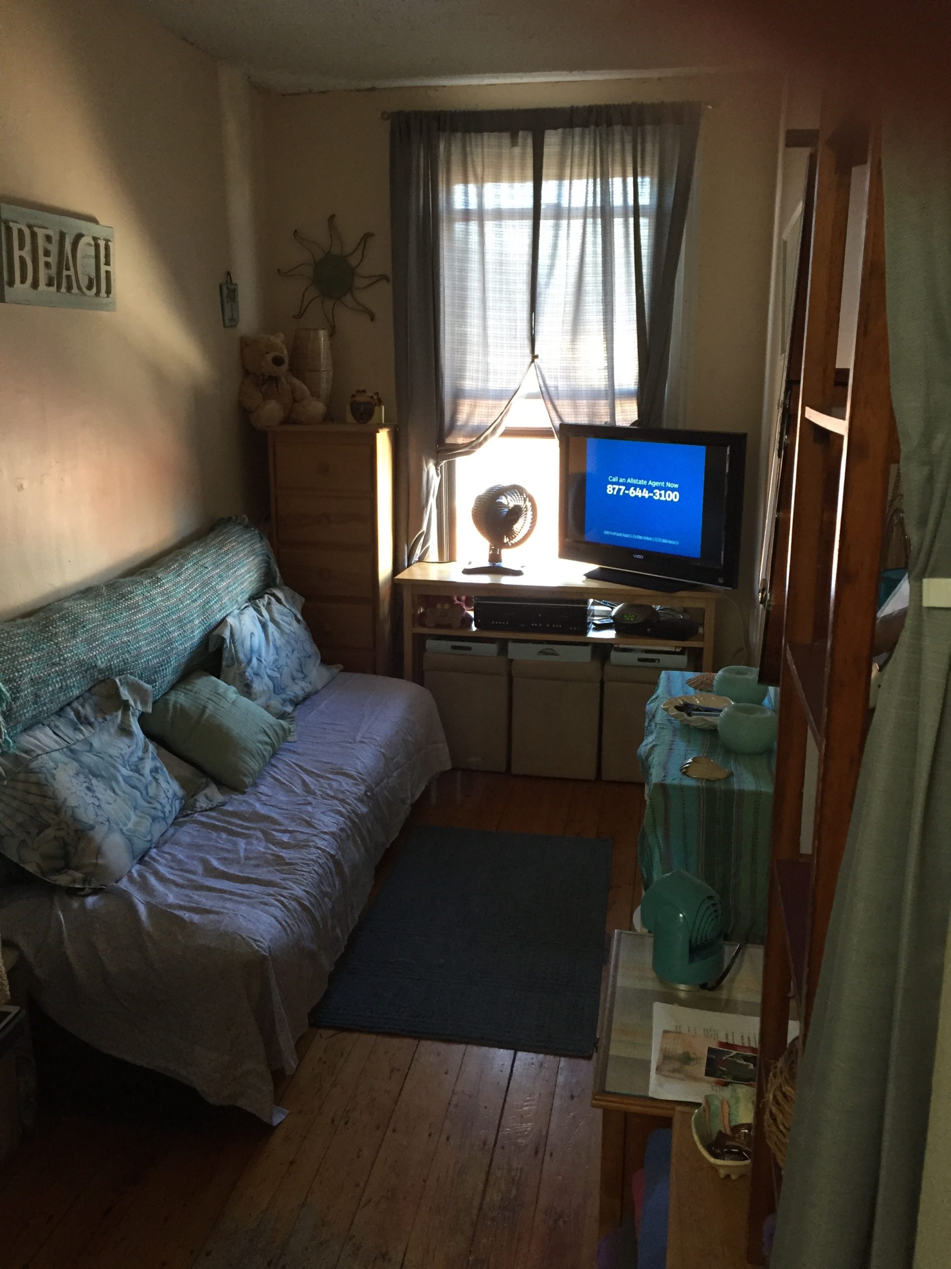 When the futon was folded up there was space to walk and my mind had started to ease. My tension was starting to lift a bit and I was feeling better about this move. It was a huge change so stress was expected. I wasn’t used to all the constant noise outside. The traffic was never-ending, people talking loudly, yelling, honking, buses driving by, it was all sounds that I never heard in Rockport. I was hoping I would get used to it in time. The window was nice in the room and I think that helped it a lot. There was constant light coming through.